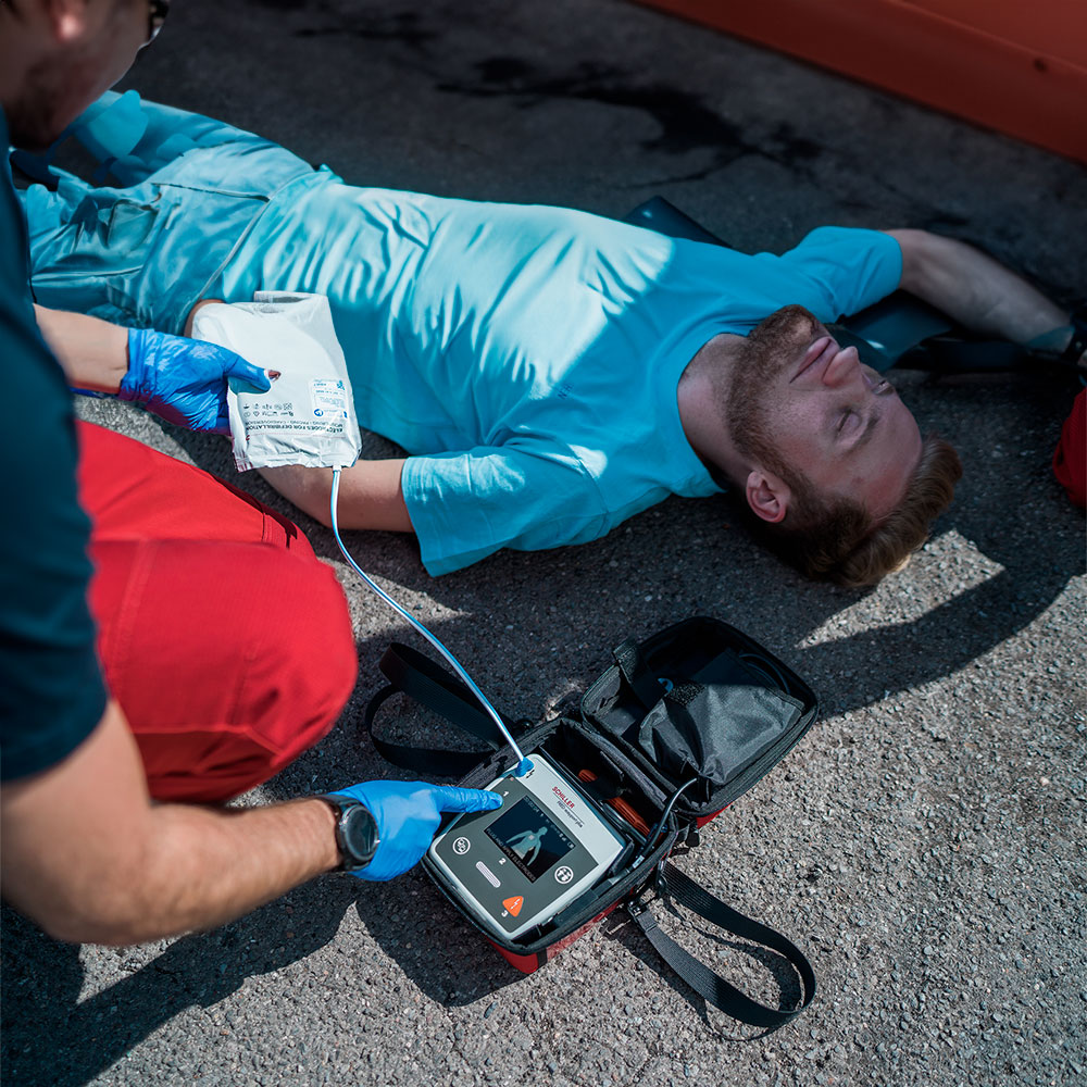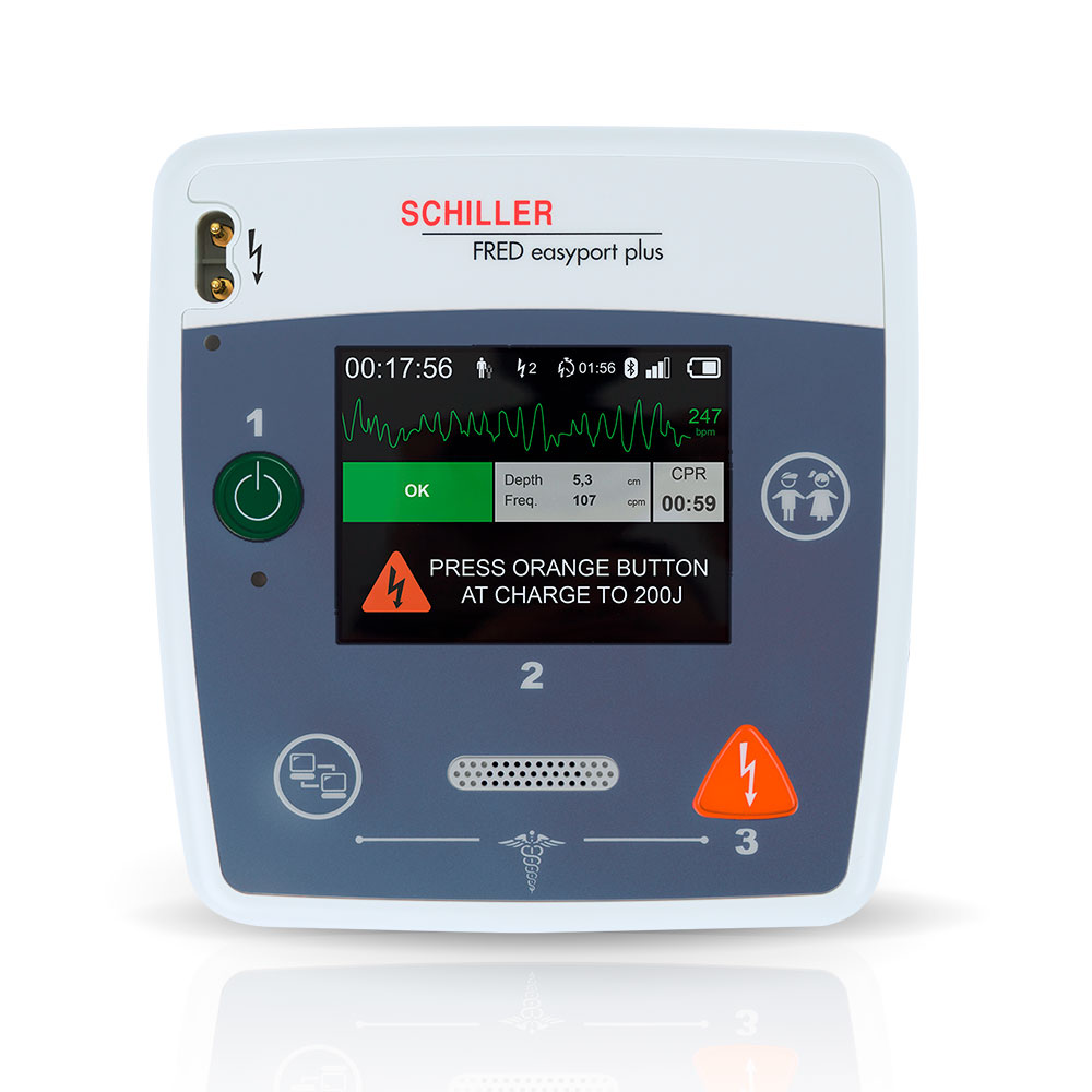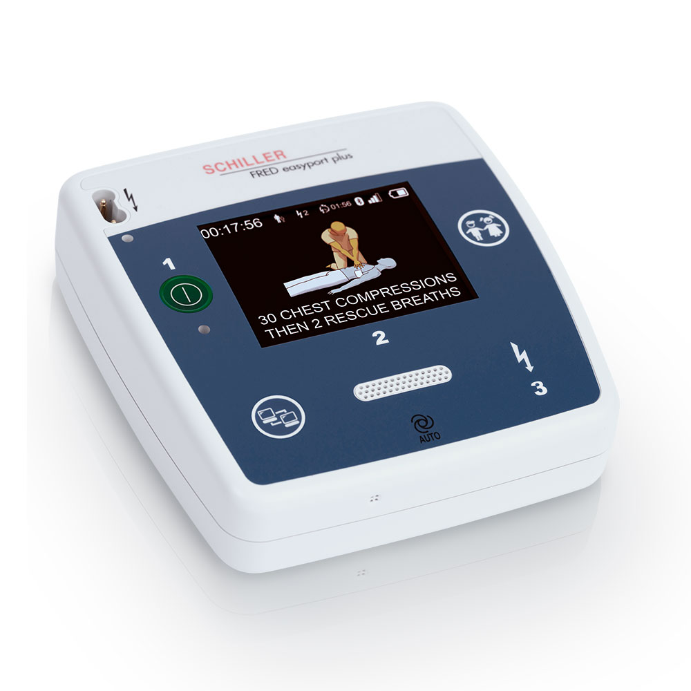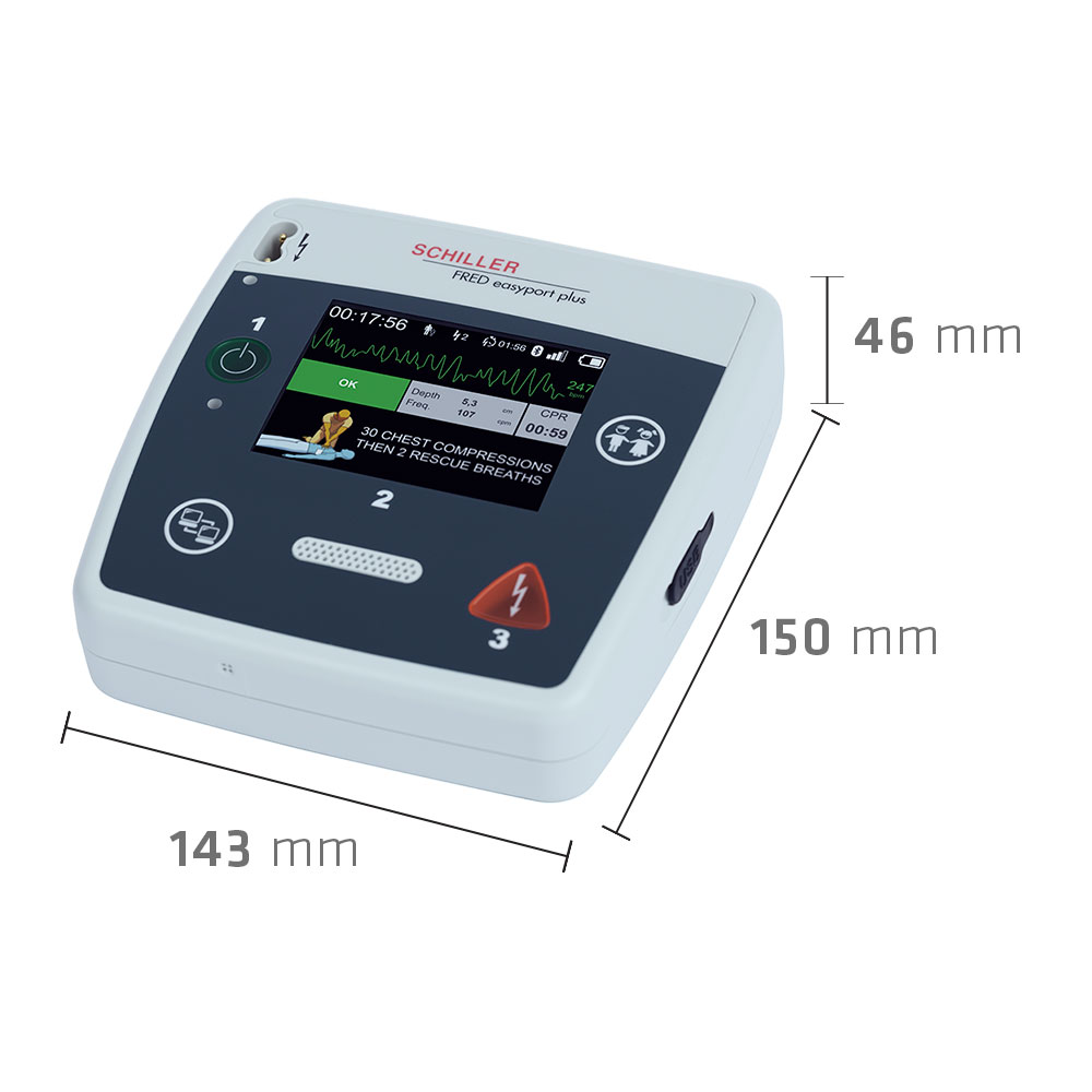 FRED easyport plus es desfibrilación de bolsillo. Sólo mide 46 x 150 x 143 mm y pesa 870 g con batería y electrodos. Está disponible en 3 versiones distinguibles por color: azul claro – FRED easyport plus automático. Gris – FRED easyport plus semiautomático. Naranja – FRED easyport plus semiautomático modo manual.